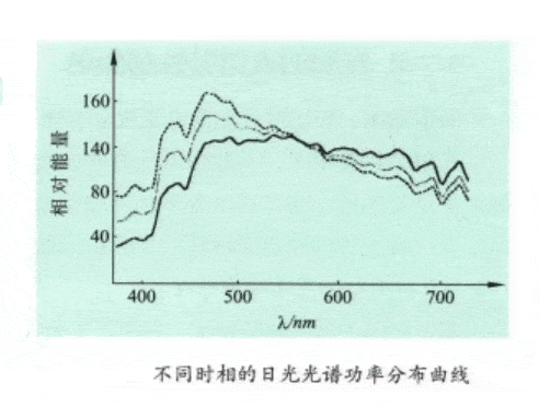 日光的光譜沒有人造光源穩(wěn)定,不同氣候下、不同時間,它的相對光譜功率分布曲線的形狀是不同的,如圖下圖所示。這就是為什么早晚看到的是紅霞,正午看到的是通常所說的白光。